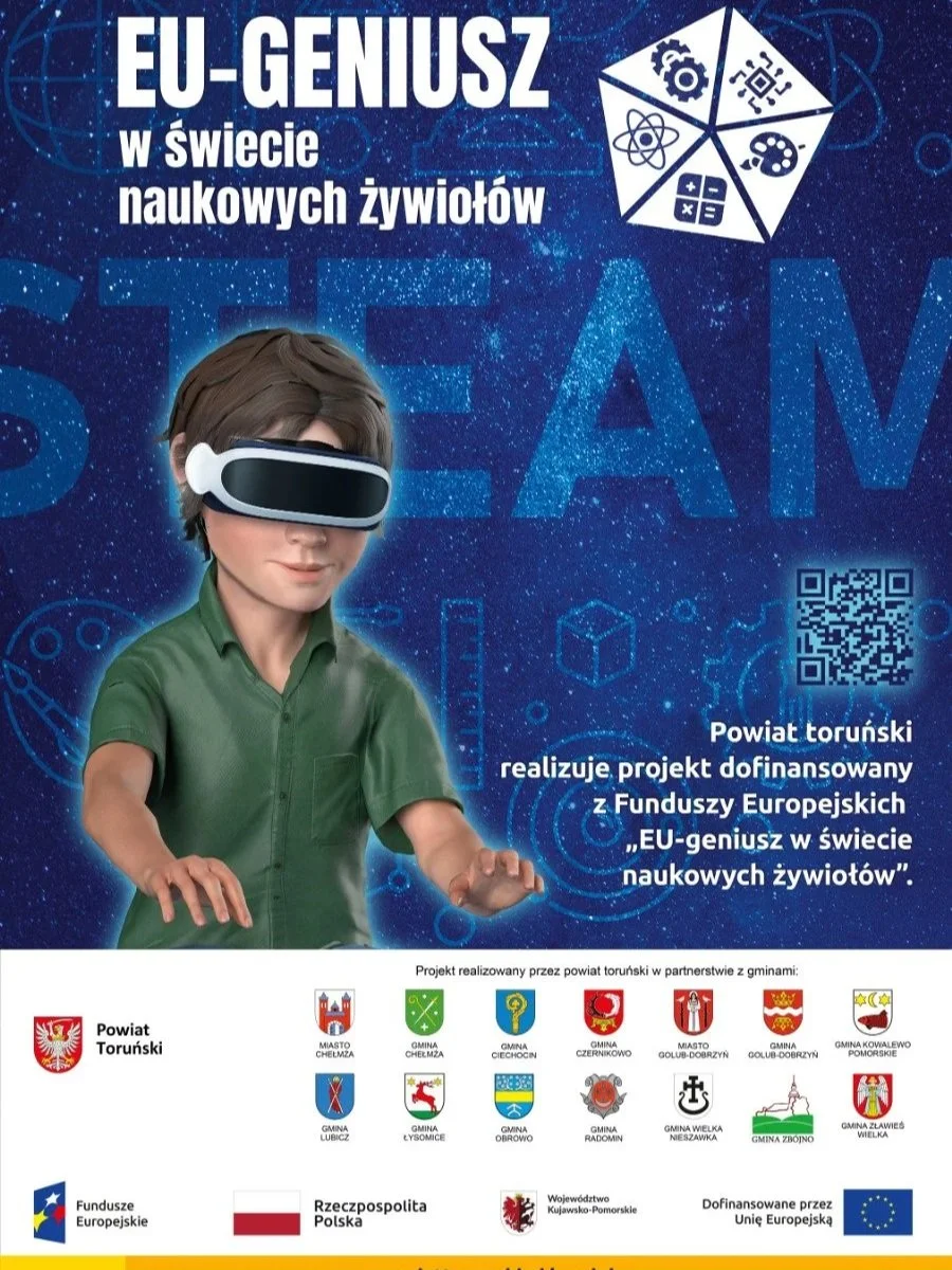w projekcie „EU-geniusz w świecie naukowych żywiołów”. To partnerskie przedsięwzięcie, które Starostwo Powiatowe w Toruniu jako lider realizuje wraz z 14 samorządami z powiatu toruńskiego i golubsko-dobrzyńskiego. Projekt realizowany jest od 1 listopada 2024 r. do 30 czerwca 2028 r., a jego całkowity budżet wynosi 18 915 389,90 zł. Celem projektu jest podniesienie kompetencji kluczowych i umiejętności, które uczniowie rozwijać będą poprzez dodatkowe zajęcia z zakresu STEAM. Projekt zakłada wsparcie dla 55 szkół ogólnokształcących w powiatach toruńskim i golubsko-dobrzyńskim oraz podniesienie kwalifikacji 690 nauczycieli, co pozwoli na wprowadzenie nowoczesnych metod nauczania w oparciu o model STEAM.
