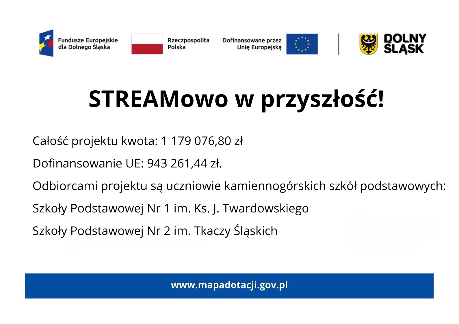 Celem projektu jest „Zwiększenie szans edukacyjnych, a tym samym przyczynienie się do osiągnięcia neutralnej dla klimatu gospodarki UE przez 600 uczniów w wieku 7-14 lat, w tym 27 uczniów z niepełnosprawnościami ze Szkoły Podstawowej Nr 1 im. ks. J. Twardowskiego oraz Szkoły Podstawowej Nr 2 im. Tkaczy Śląskich w Kamiennej Górze”. W ramach projektu pn.: “STREAM-owo w przyszłość!”, nr projektu FEDS.08.01-IZ.00 0027/24-00 współfinansowanego ze środków Europejskiego Funduszu Społecznego Plus, w ramach programu Fundusze Europejskie dla Dolnego Śląska 2021-2027, powierzono nam zadanie realizacji zajęć dla dzieci klas I-III pn.: “STREAM-owe zabawy nauką” oraz klas IV-VIII pn.: “STREAM-owy Lab Przyszłości” w okresie od lutego 2026 r. do stycznia 2027 r.