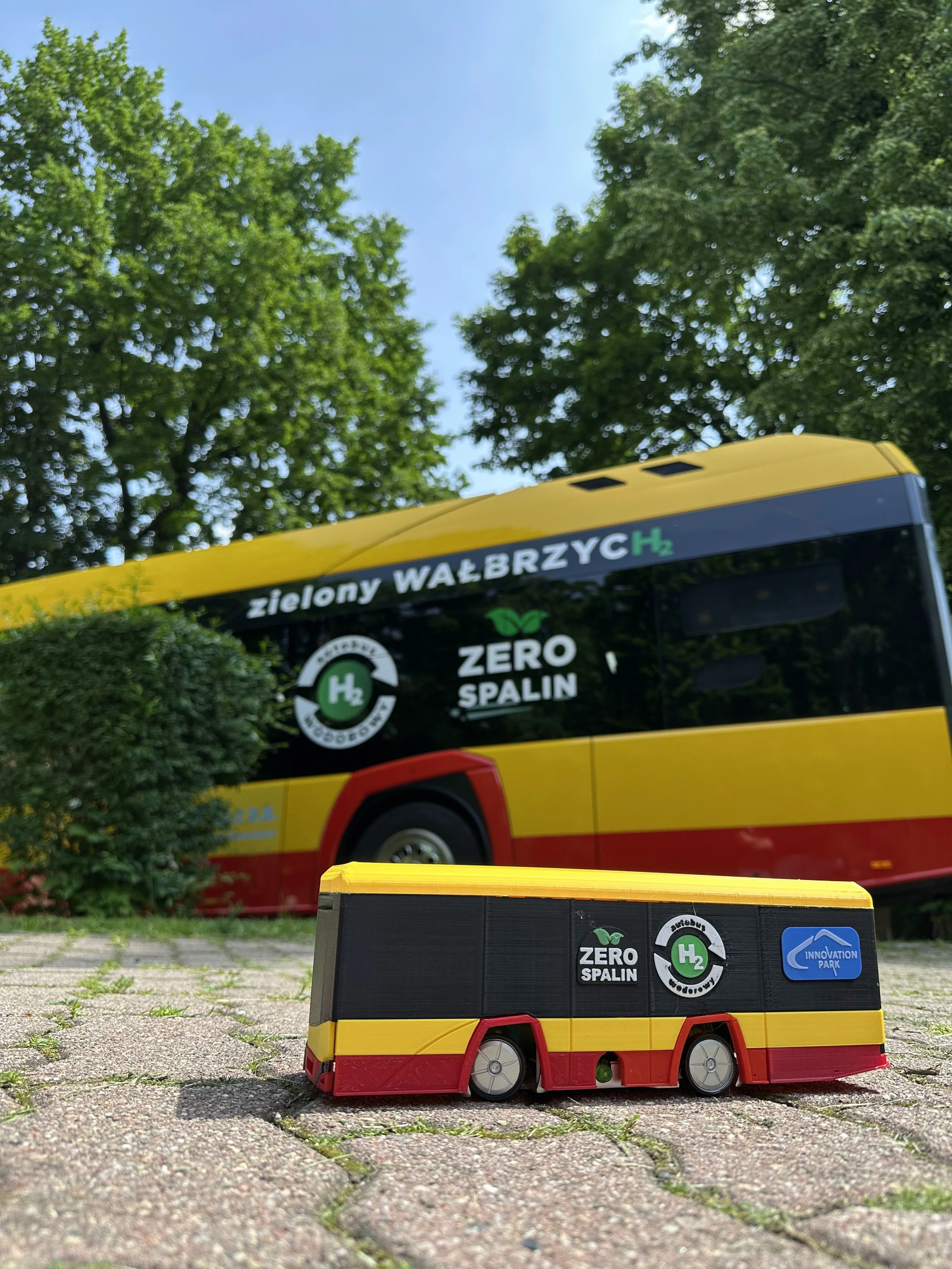 Wałbrzych, jako jedno z pierwszych miast w Polsce, odważnie postawił na rewolucję wodorową i zeroemisyjny transport. Aby każdy mógł zrozumieć, na czym polega ten proces, zaprojektowaliśmy i wydrukowaliśmy w 3D własny tabor autobusów wodorowych. Wyposażyliśmy go w napęd zasilany paliwem wodorowym i ... na naszej makiecie poruszają się one dzięki wodorowi, który na bieżąco produkujemy w prawdziwych, miniaturowych ogniwach paliwowych!